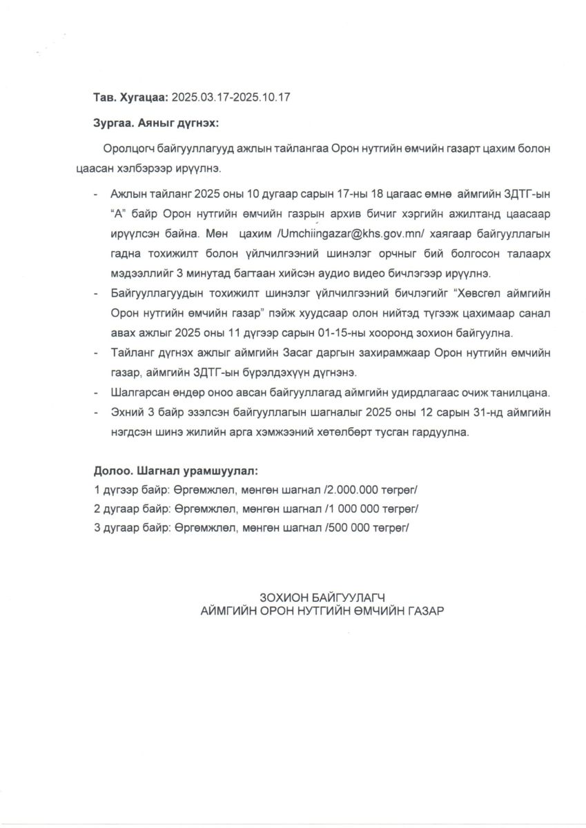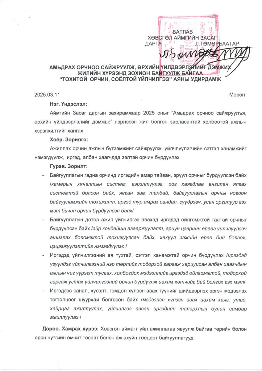 Хөвсгөл аймаг 2025 оныг "Амьдрах орчноо сайжруулж, өрхийн үйлдвэрлэлийг дэмжих" жил болгон зарласан. 2025 оны 03-р сарын 06-16 ны өдрүүдэд "Нэрлэсэн жил" ийн туг Орон нутгийн өмчийн газарт аялж байна. Орон нутгийн өмчийн газраас төрийн болон орон нутгийн өмчийн байгууллагуудыг гадна дотор орчноо иргэдийн үйлчилгээ авах ая тухтай орчныг бүрдүүлэх, угтах үдэх үйлчилгээг хэвшүүлэх зорилгоор "Тохитой орчин, соёлтой үйлчилгээ" болзолт аяныг зохион байгуулж байна. та бүхэн идэвхтэй оролцоно уу?