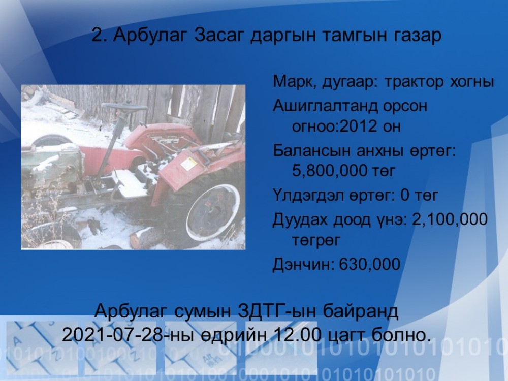 Аймгийн ИТХ-ын Тэргүүлэгчдийн 2021 оны 06 дугаар сарын 25-ны өдрийн 70 дугаар тогтоолоор дараах хөрөнгийн нээлттэй дуудлага худалдааг зарлаж байна. Худалдах хөрөнгийг очиж үзэж болох бөгөөд дуудлагын худалдааны журам, бүртгэлтэй холбоотой мэдээллийг Орон нутгийн өмчийн газрын 70382348 утсаар лавлана уу.