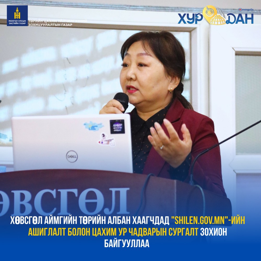 Төрийн цахим үйлчилгээний зохицуулалтын газрын Чанар хяналтын газар, Сургалт хөгжлийн хэлтсийн албан хаагчид Хөвсгөл аймагт томилолтоор ажиллаж, төрийн ил тод байдлыг хангах, цахим ур чадварыг нэмэгдүүлэх сургалтыг зохион байгууллаа. Уг сургалтад байгууллагын ахлах нягтлан бодогч хамрагдсан.