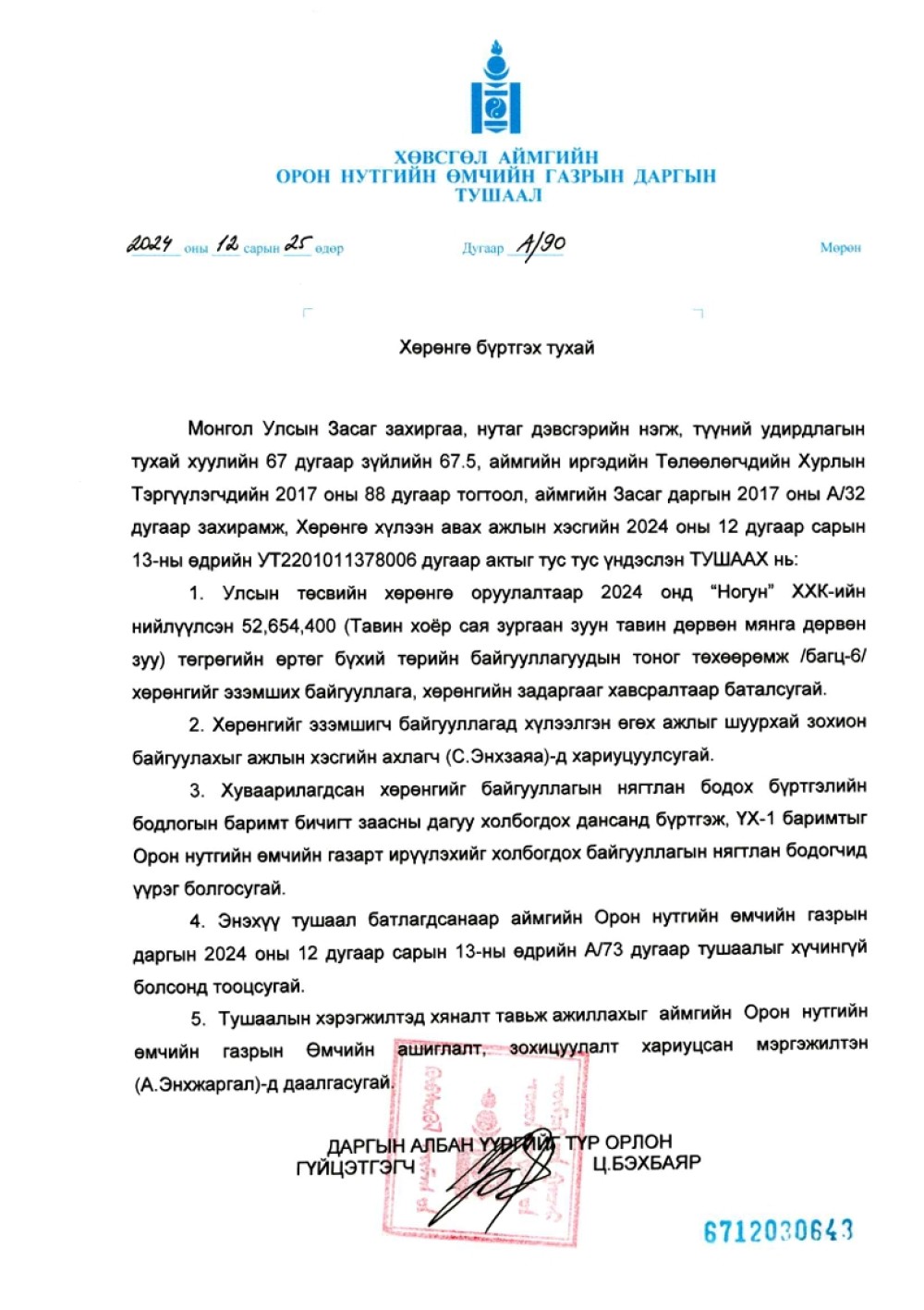 Орон нутгийн өмчийн газрын даргын 2024 оны тушаал