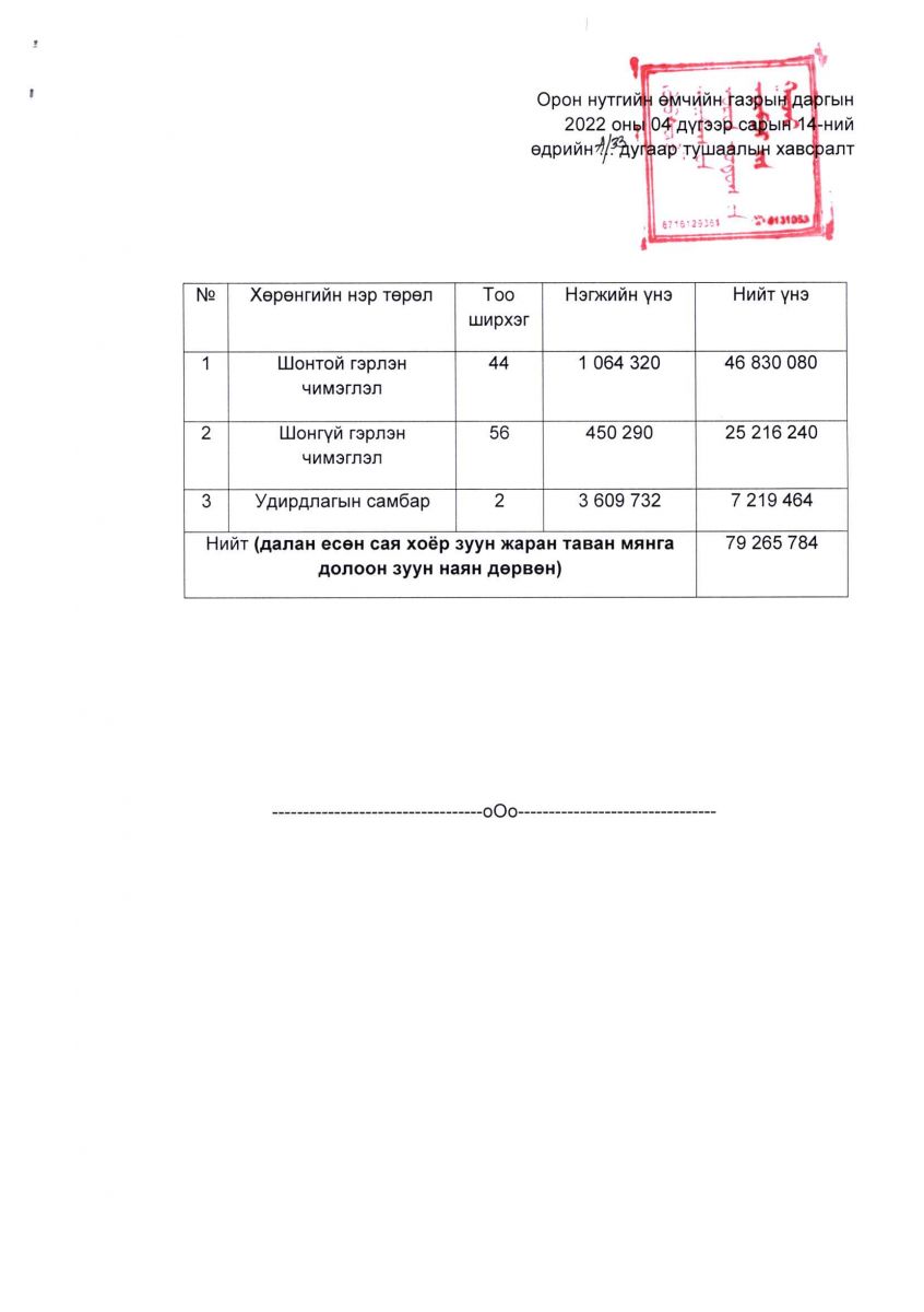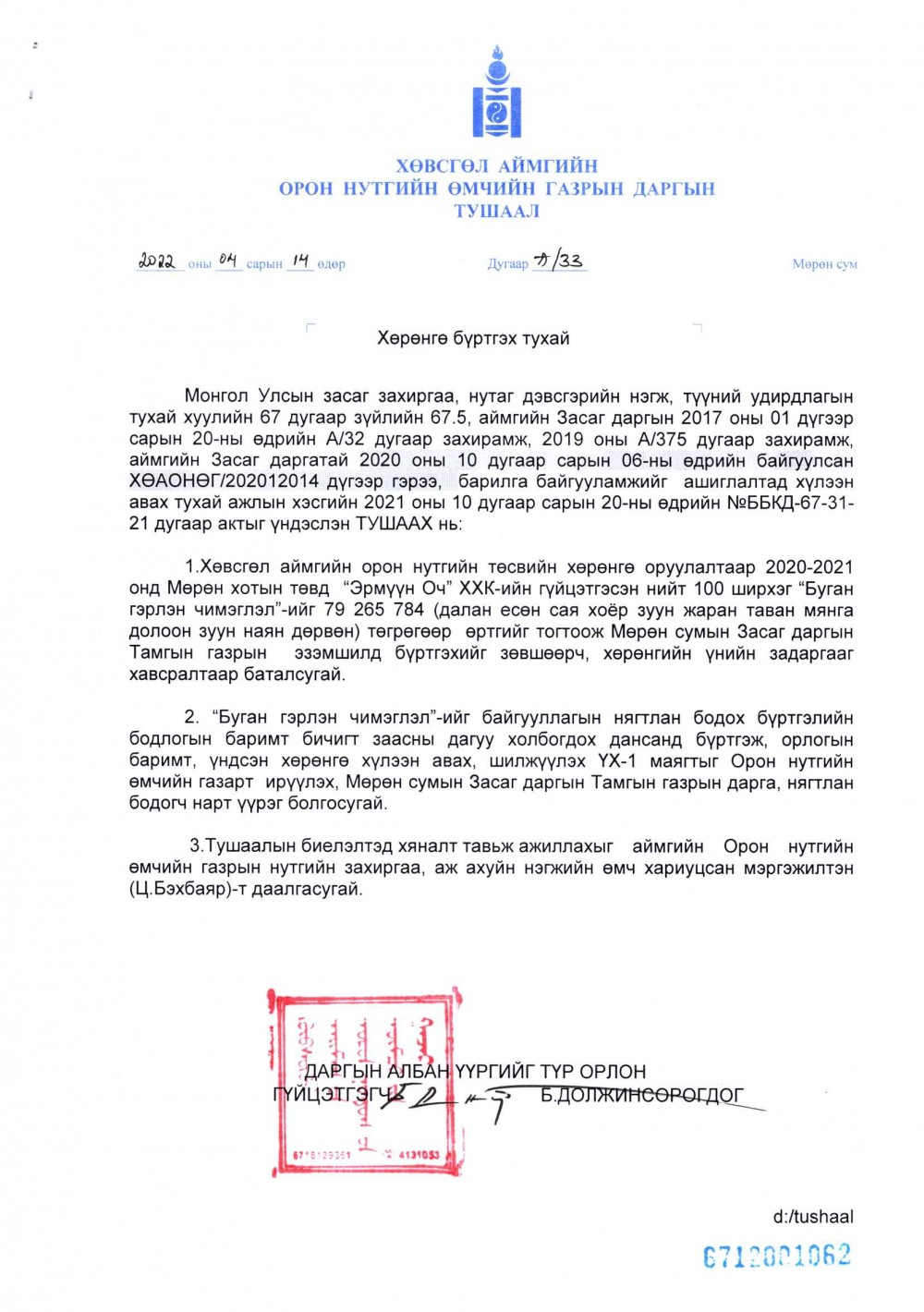 Орон нутгийн өмчийн газрын 2022 оны 04 дүгээр сарын 14-ний өдрийн А33 дугаар тушаалаар Орон нутгийн төсвийн хөрөнгө оруулалтаар хийгдсэн "Буган гэрлэн" чимэглэлийг Мөрөн сумын ЗДТГын эзэмшилд бүртгүүлэх шийдвэр гаргалаа