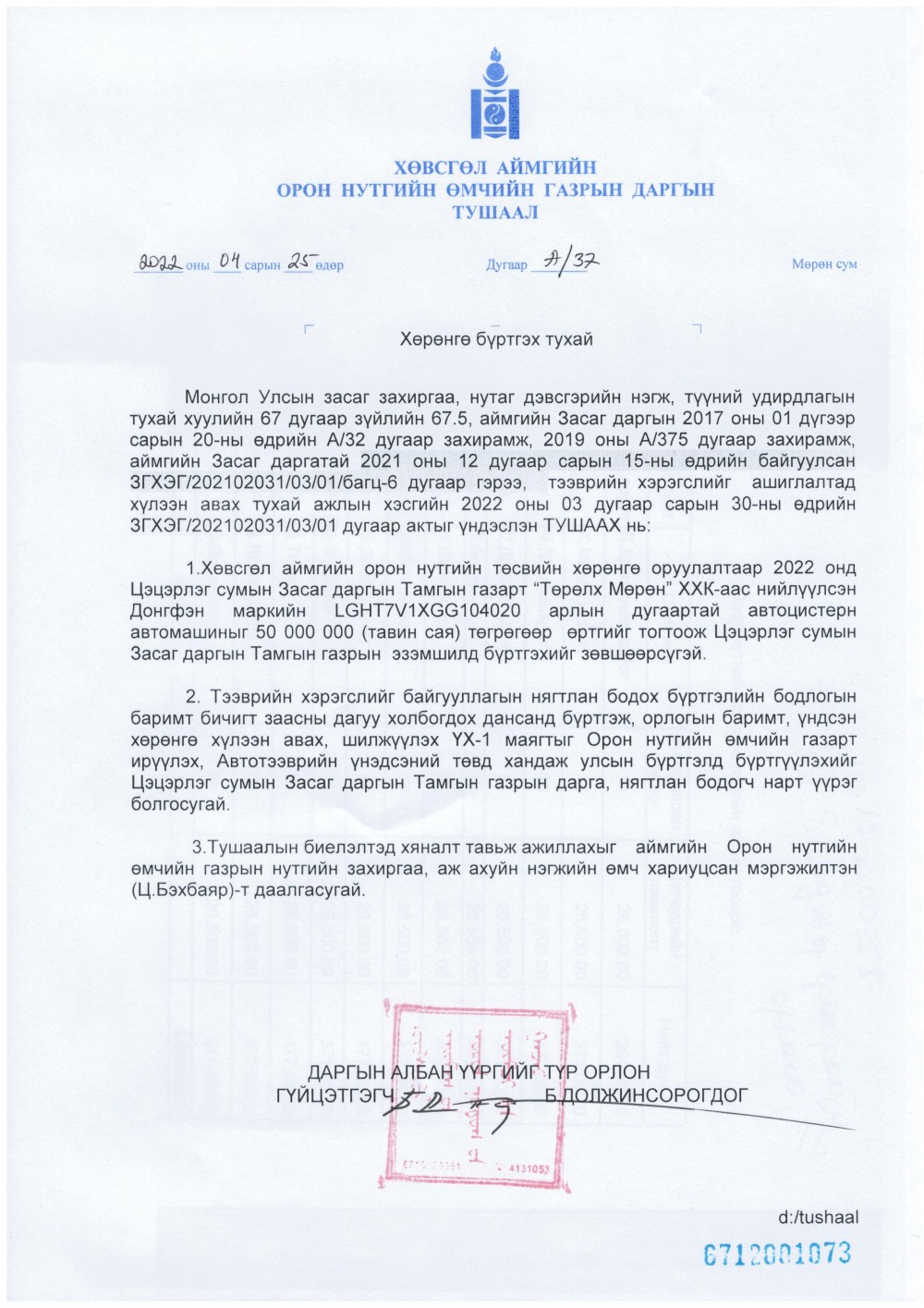 Орон нутгийн өмчийн газрын даргын 2022 оны 04 дүгээр сарын 25-ны өдрийн А37 дугаар тушаалаар орон нутгийн төсвийн хөрөнгөөр худалдан авсан ус тээврийн автомашиныг Цэцэрлэг сумын ЗДТГ-т эзэмшүүлэх шийдвэр гаргалаа