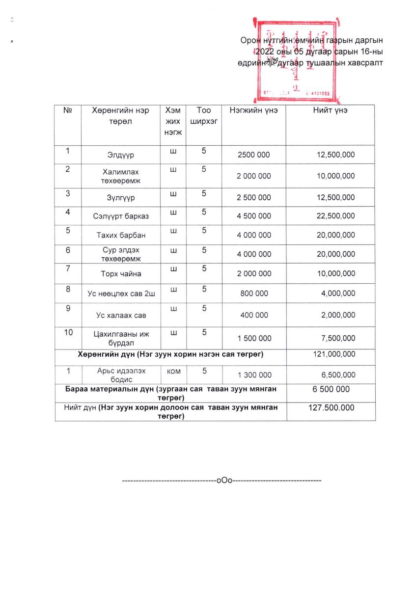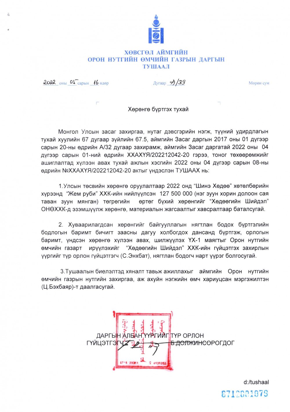 Орон нутгийн өмчийн газрын даргын 2022 оны 05 дугаар сарын 16-ны өдрийн А/39 дүгээр тушаалаар улсын төсвийн хөрөнгө оруулалтаар худалдан авсан "Арьс шир элдэх тоног төхөөрөмж" -ийг орон нутгийн өмчит "Хөдөөгийн Шийдэл" ХХК-д бүртгүүлэх шийдвэр гаргалаа