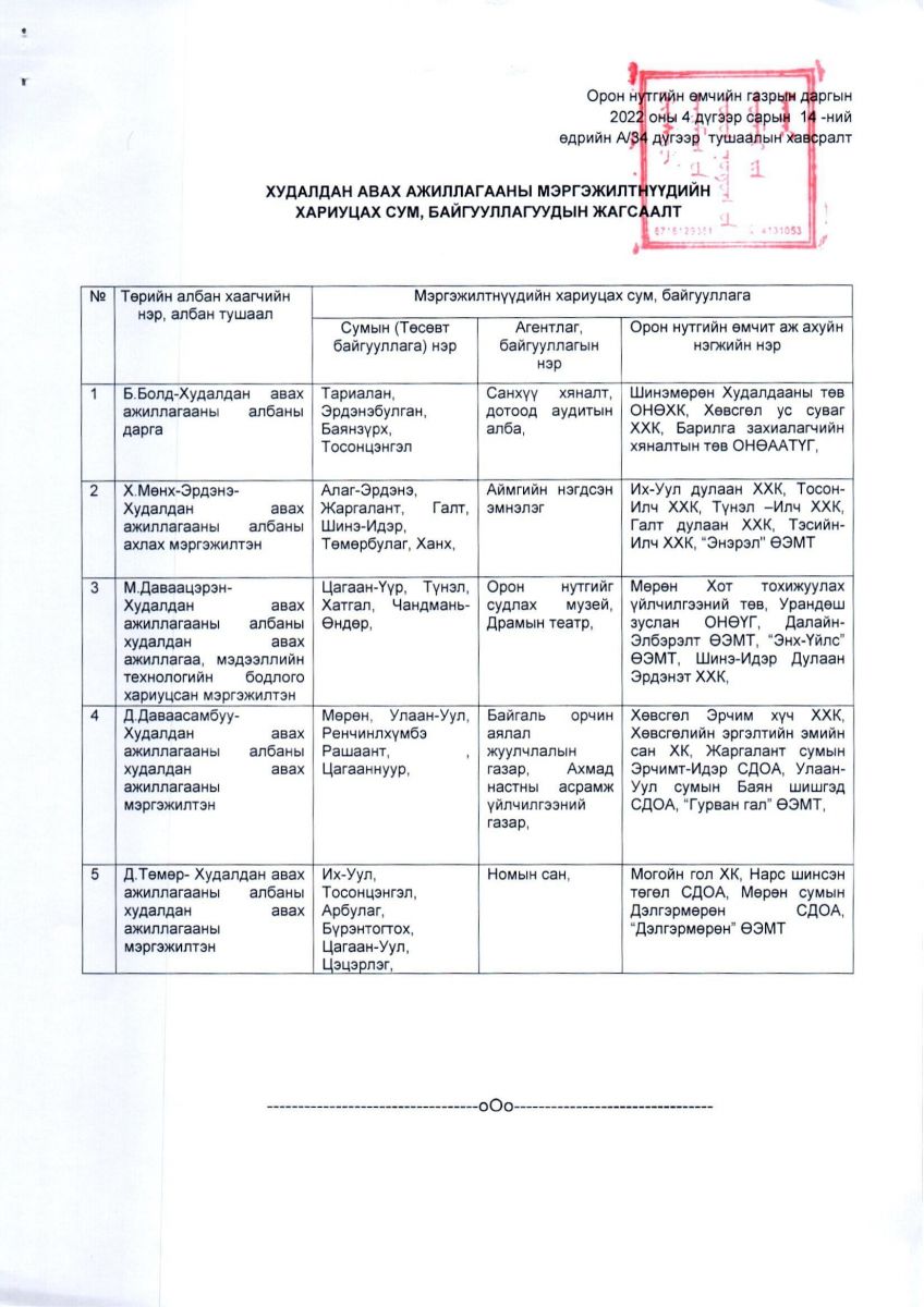 Мэргэжилтнүүдэд сум, байгууллагыг хариуцуулах тухай