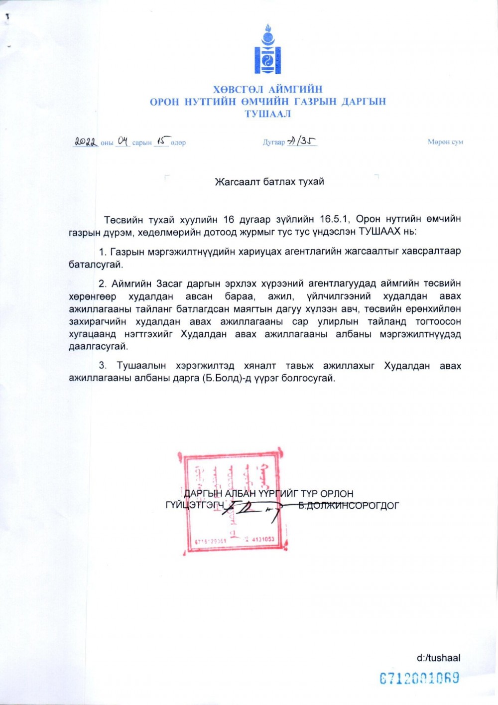 Хөрөнгө бүртгэх тухай ОНӨГ-ын даргын 2025 оны 07 дугаар сарын 09-ний өдрийн А/33 дугаар тушаал