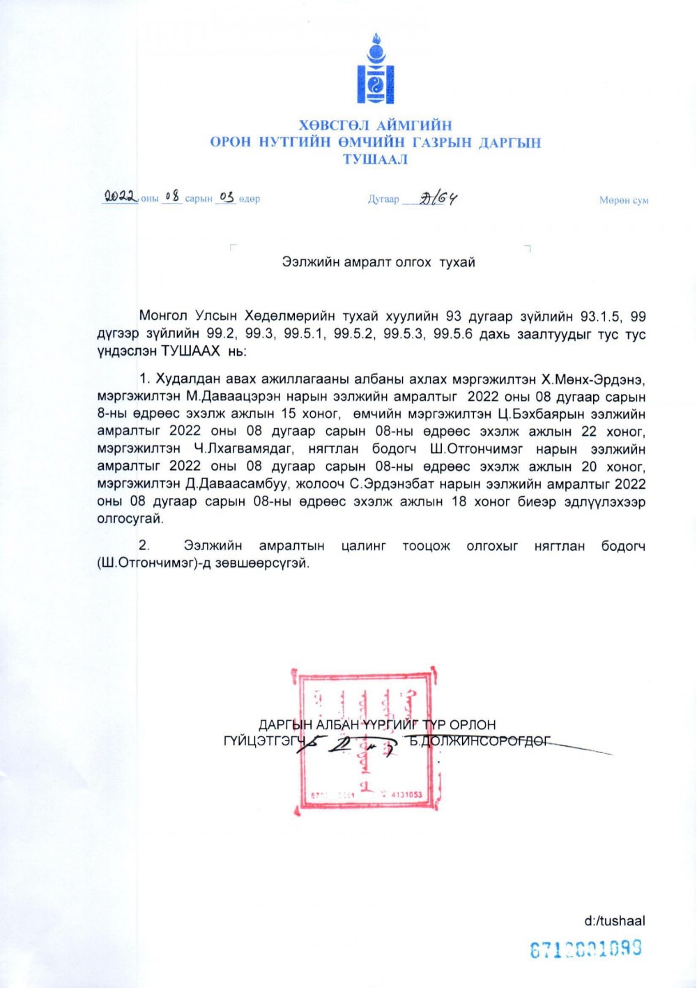 МОНГОЛ УЛСЫН “ТӨРИЙН АЛБАНЫ ӨДӨР”-ИЙГ УГТАН ТӨРИЙН АЛБАН ХААГЧИД ТАНГАРАГ ӨРГӨЛЛӨӨ