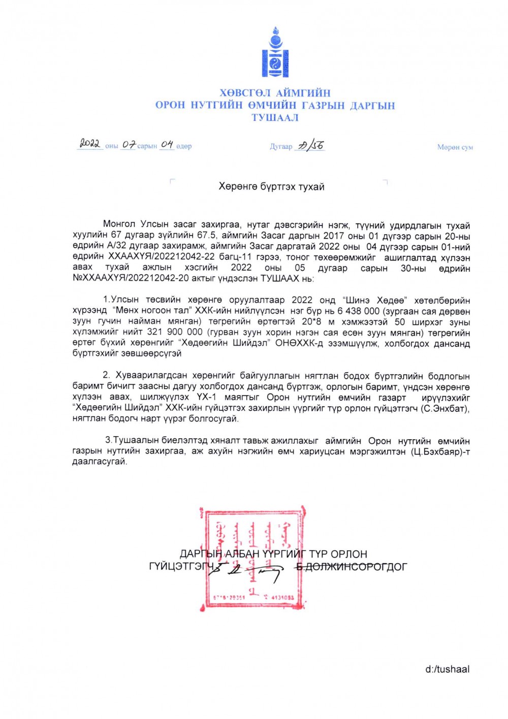 Орон нутгийн өмчийн газрын даргын 2022 оны 07 дугаар сарын 04-ний өдрийн А/56 дугаар тушаалаар Шинэ хөдөө төслийн хүрээнд улсын төсвийн хөрөнгө оруулалтаар нийлүүлэгдсэн 50 ширхэг хүлэмжийг орон нутгийн өмчит "Хөдөөгийн Шийдэл" ХХК-д эзэмшүүлэх шийдвэр гаргалаа