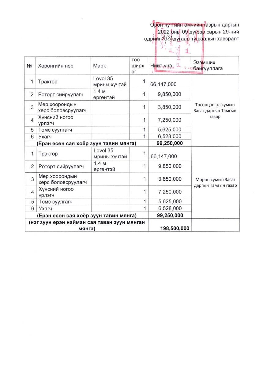 Орон нутгийн өмчийн газрын даргын 2022 оны 09 дүгээр сарын 29 ний өдрийн А/78 дугаар тушаалаар улсын төсвийн хөрөнгө оруулалтаар Мөнх ногоон тал ХХК-ийн нийлүүлсэн газар тариалангийн иж бүрдэл трактарыг эзэмших байгууллагыг тогтоож тушаал гаргав