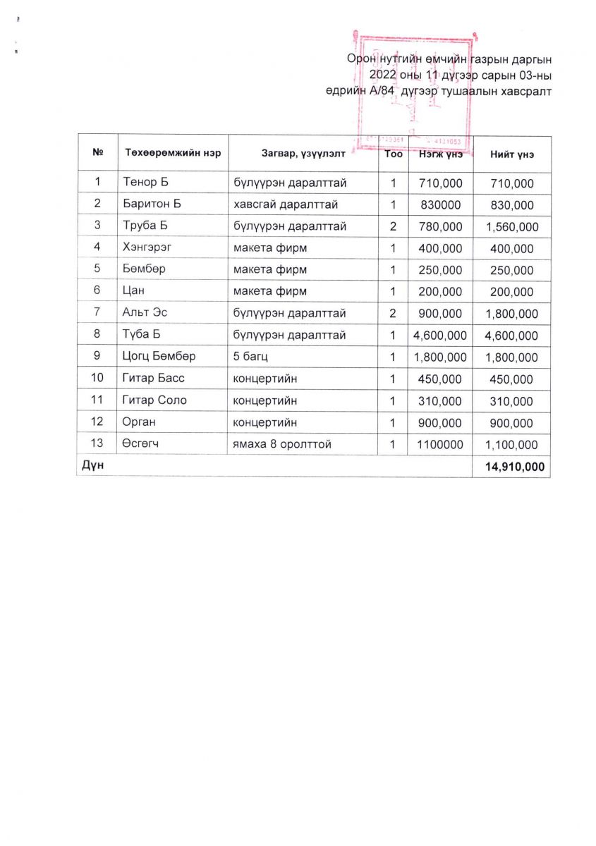 Аймгийн Орон нтгийн өмчийн газрын даргын 2022 оны 11 дүгээр сарын 3-ны өдрийн А84 дүгээр тушаалаар Мөрөн сумын Засаг даргын Тамгын газарт хөгжим хэрэгслийг эзэмшүүлэх шийдвэр гарлаа. Уг хөгжим хэрэгслийг Мөрөн сумын Ахмадын хорооны амьд хөгжмийн хамтлаг гэрээгээр ашиглах юм.
