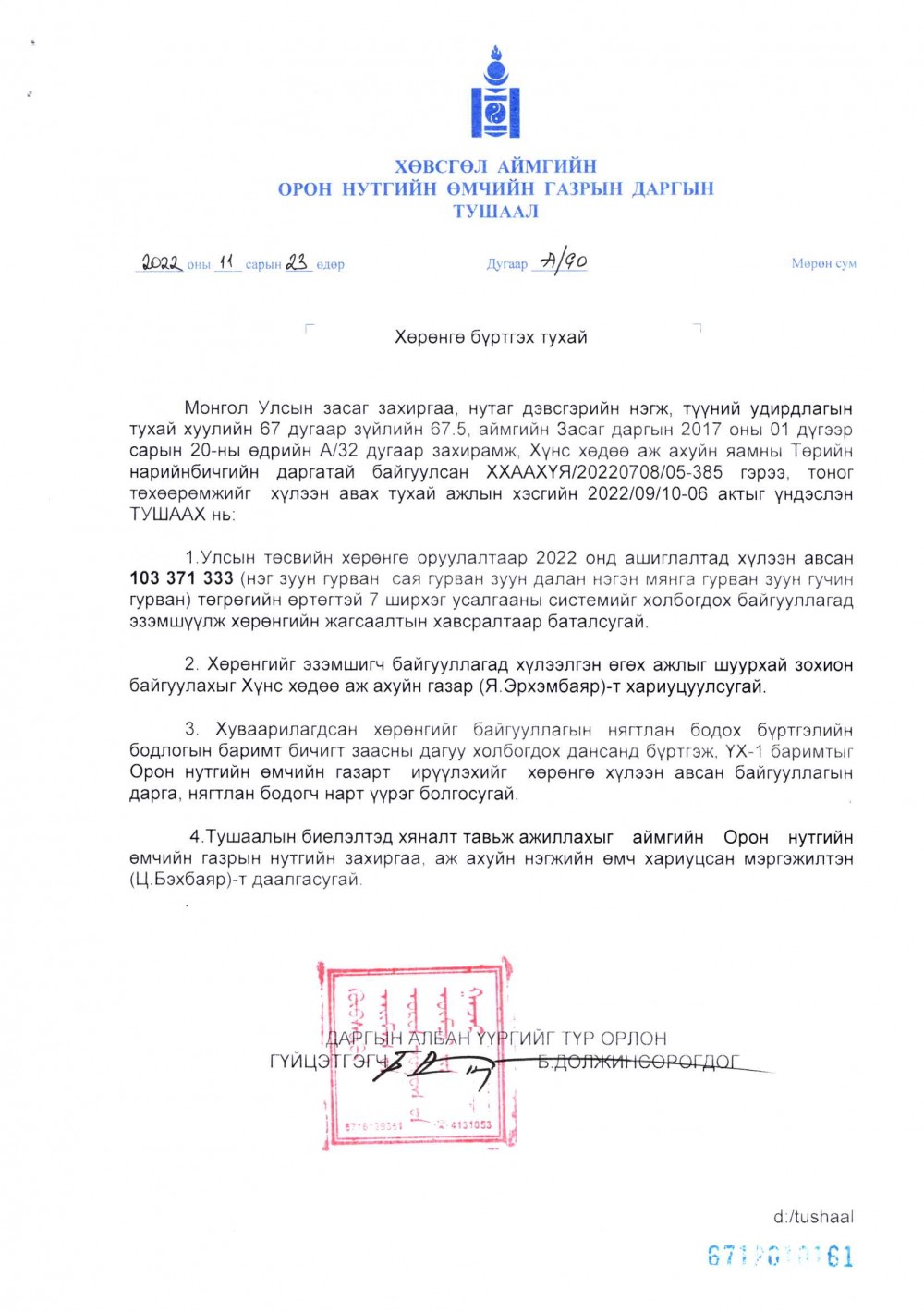 Улсын төсвийн хөрөнгө оруулалтаар Бүрэнтогтох, Тосонцэнгэл, Түнэл, Рашаант сумын ЗДТГ-т олгосон урсгалын хүчээр ус хуримтлуулах усалгааны тоног төхөөрөмжийг Орон нутгийн өмчийн газрын даргын 2022 оны 11 дүгээр сарын 23-ны өдрийн А/90 дүгээр тушаалаар хөрөнгө эзэмшүүлэх шийдвэр гарлаа