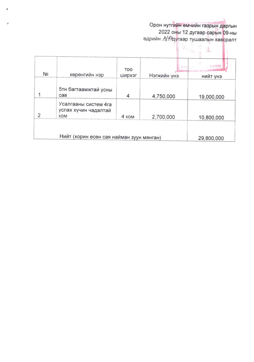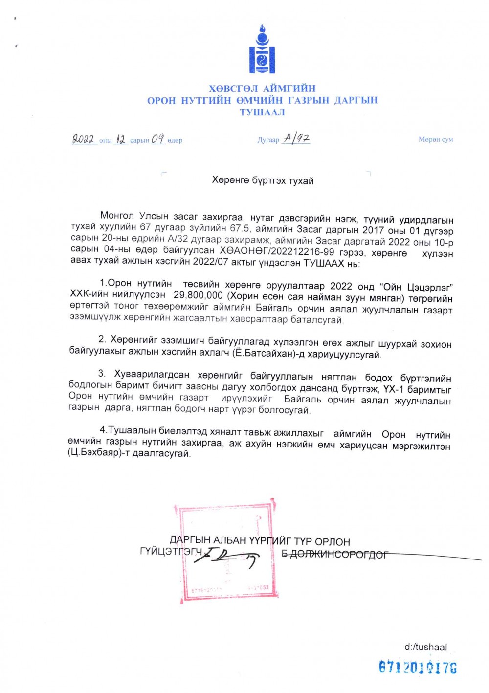 Байгаль орчин нөхөн сэргээх арга хэмжээний зардлаас "Ойн Цэцэрлэг" ХХК-ийн нийлүүлсэн усалгааны тоног төхөөрөмж дагалдах хэрэгслийг Байгаль орчин, аялал жуулчлалын газарт эзэмшүүлэх тушаал гарлаа.