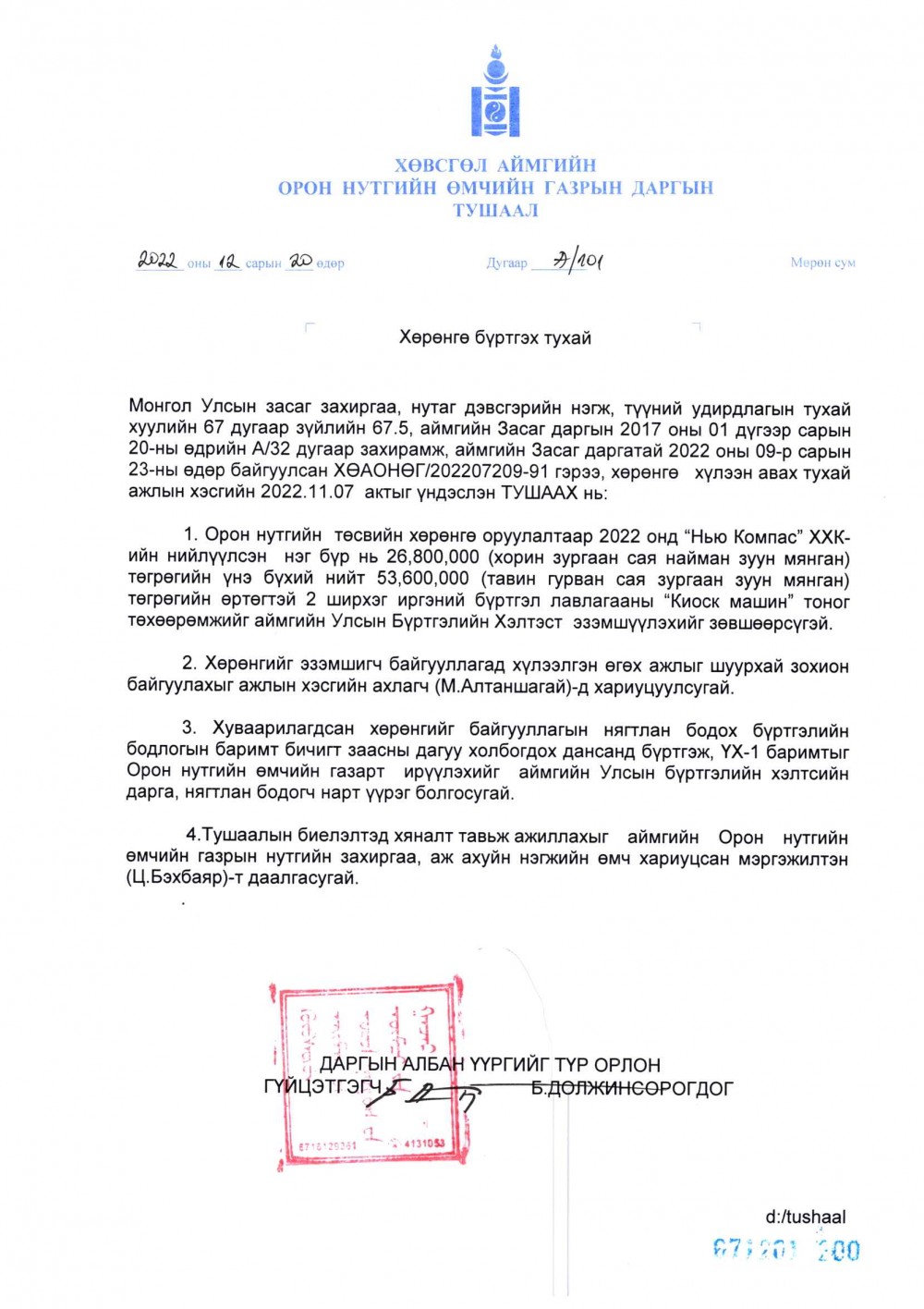 Иргэний бүртгэл лавлагааны Киоск машин бүртгүүллээ