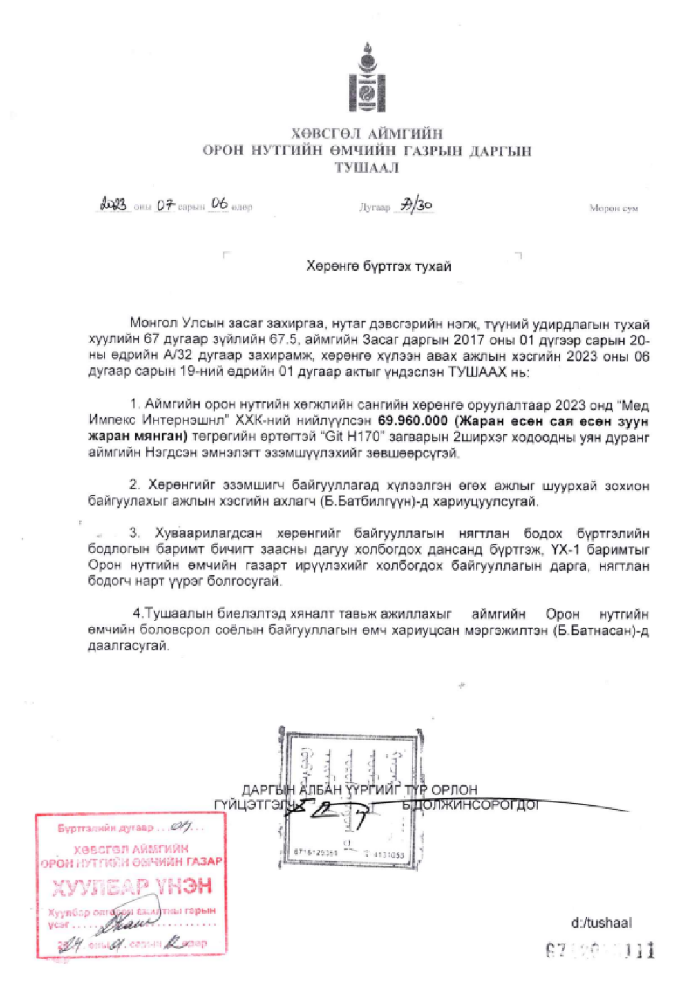 Хөрөнгө бүртгэх тухай ОНӨГ-ын даргын 2025 оны 07 дугаар сарын 09-ний өдрийн А/33 дугаар тушаал