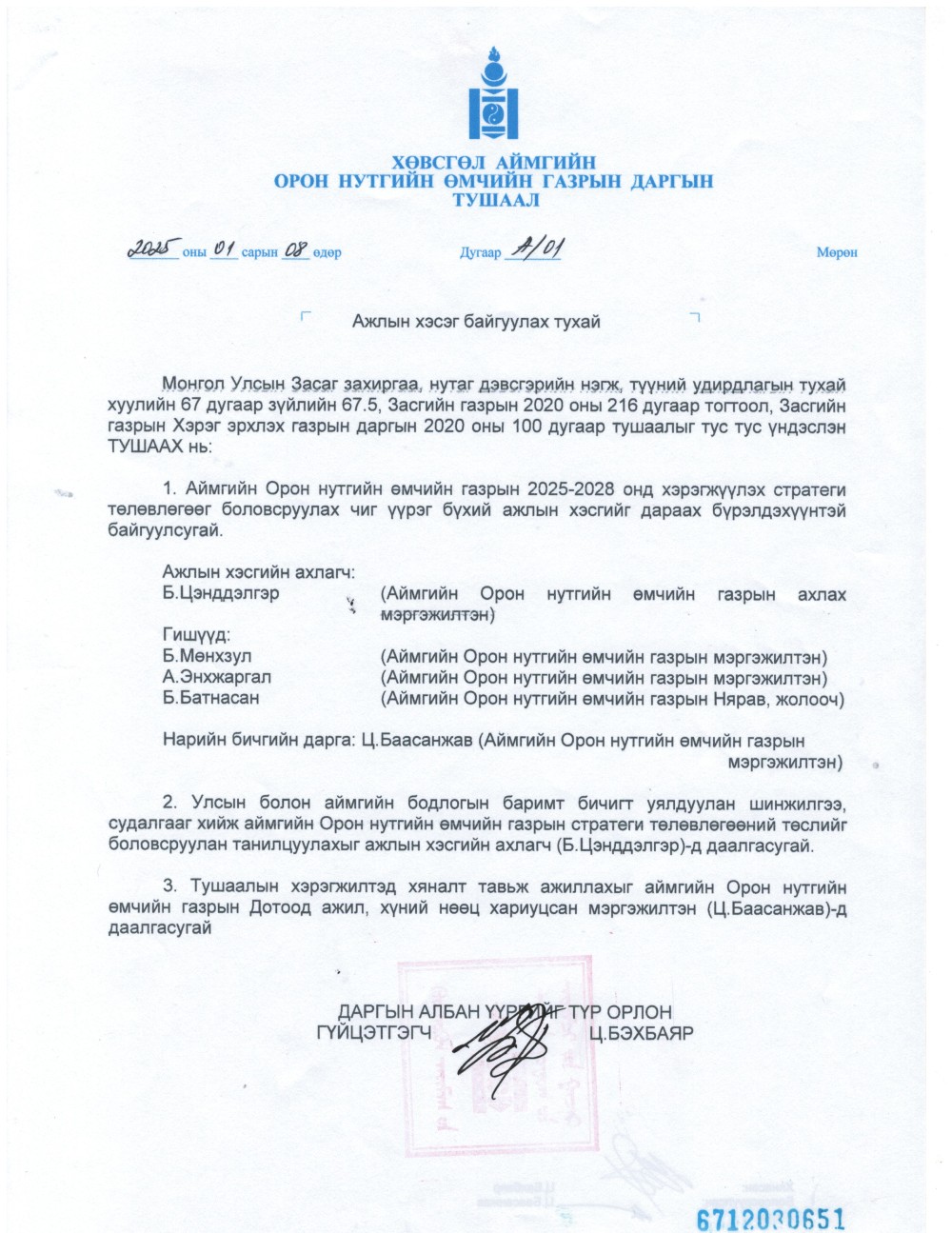 Ажлын хэсэг байгуулах тухай ОНӨГ-ын даргын 2025.01.08-ний А/01 дүгээр тушаал